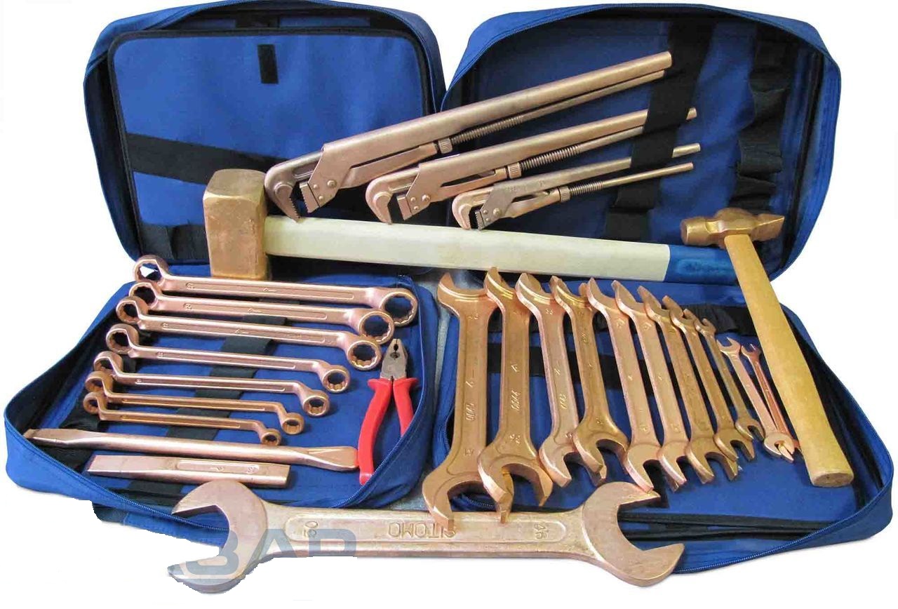Комплект искробезопасного инструмента для проведения слесарно-монтажных работ, который не дает искр при ударах, трениях, падении, срывах и т.д. Инструмент покрыт медью толщиной 30 мкм.