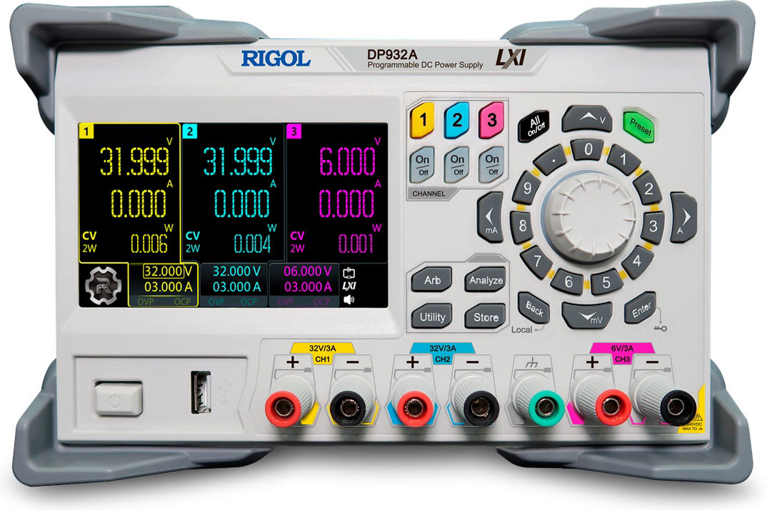 Источник питания постоянного тока лабораторный RIGOL DP932A имеет высокую точность установки и считывания параметров выходных сигналов (напряжение и сила тока) по всем трем выходным каналам, благодаря низкому уровеню шумов и пульсаций.
