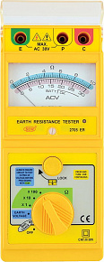 Измеритель сопротивления заземления 2705 ER: Тестовый ток 2 мА, что позволяет измерять сопротивление без отключения автоматов защиты в цепи заземления; В состав комплекта включены соединительные провода и измерительные штыри; Измерение сопротивления заземления можно проводить по 2- (грубо) и 3-проводной (точно) схеме; Возможность измерения напряжения прикосновения; 3½ аналоговый индикатор; Батарейное питание; Индикация разряда батареи; Простота, компактность, надёжность; Укладочный кейс для хранения и транспортировки; Масса 920 г.